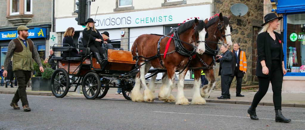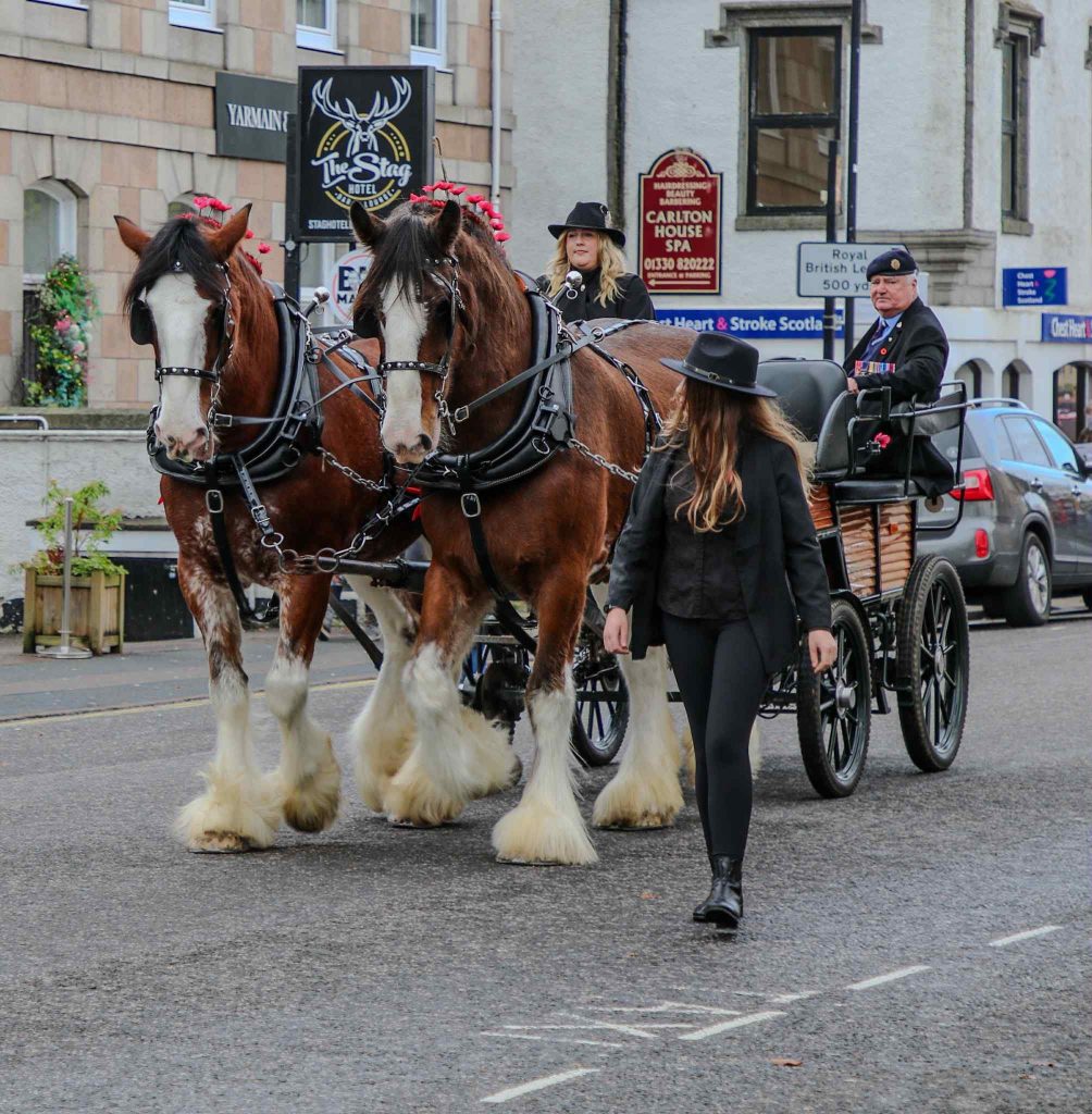 Discover exclusive luxury carriage tours led by majestic Clydesdale horses, blending elegance and comfort in every journey along scenic landscapes in Aberdeenshire, Scotland.